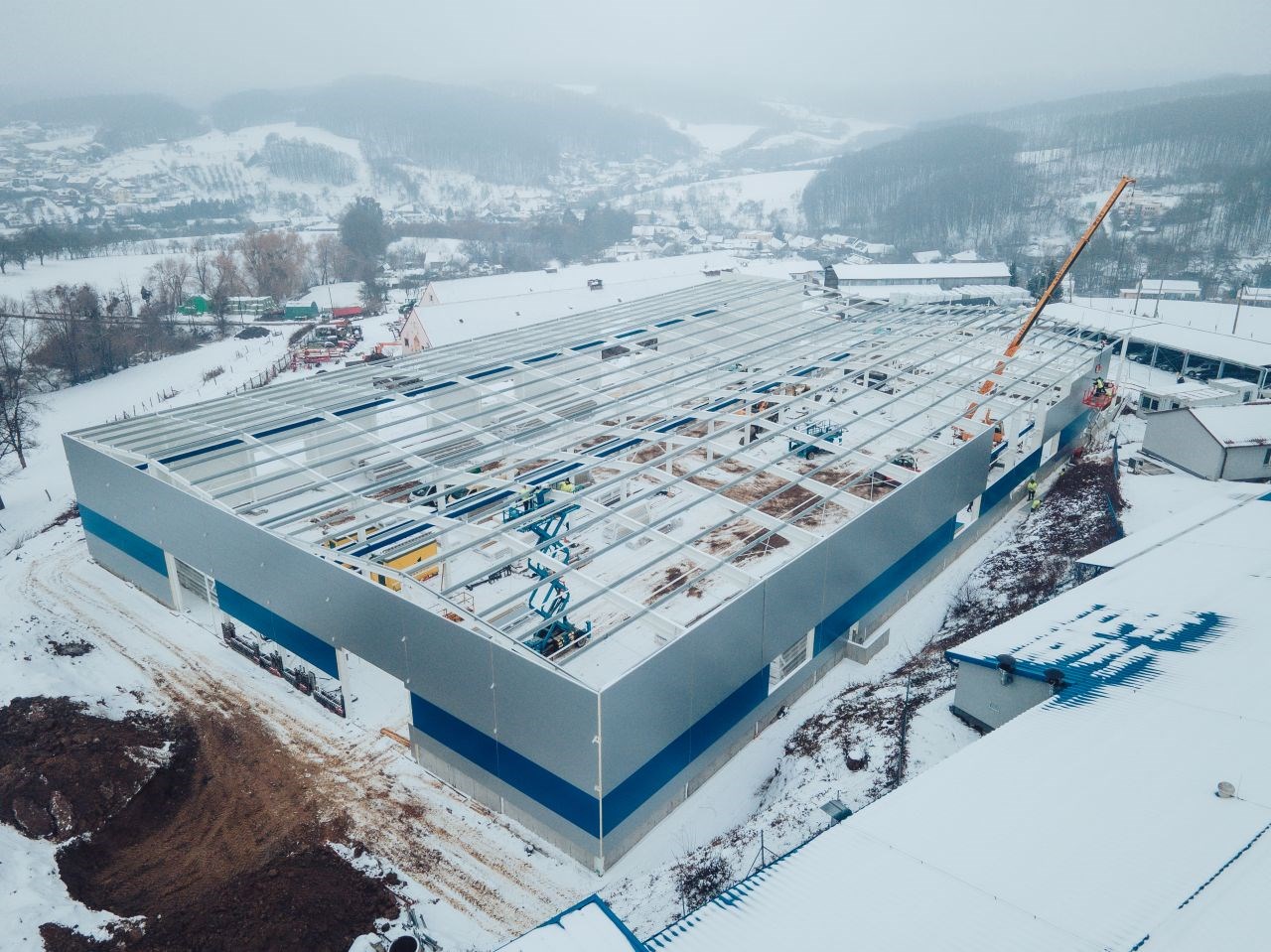 Aktuálně můžete v areálu vidět ocelovou konstrukci dvoulodní haly o ploše téměř 4 000 m². Protože bude hala sloužit pro provoz těžké techniky, je dimenzování skeletu klíčové.