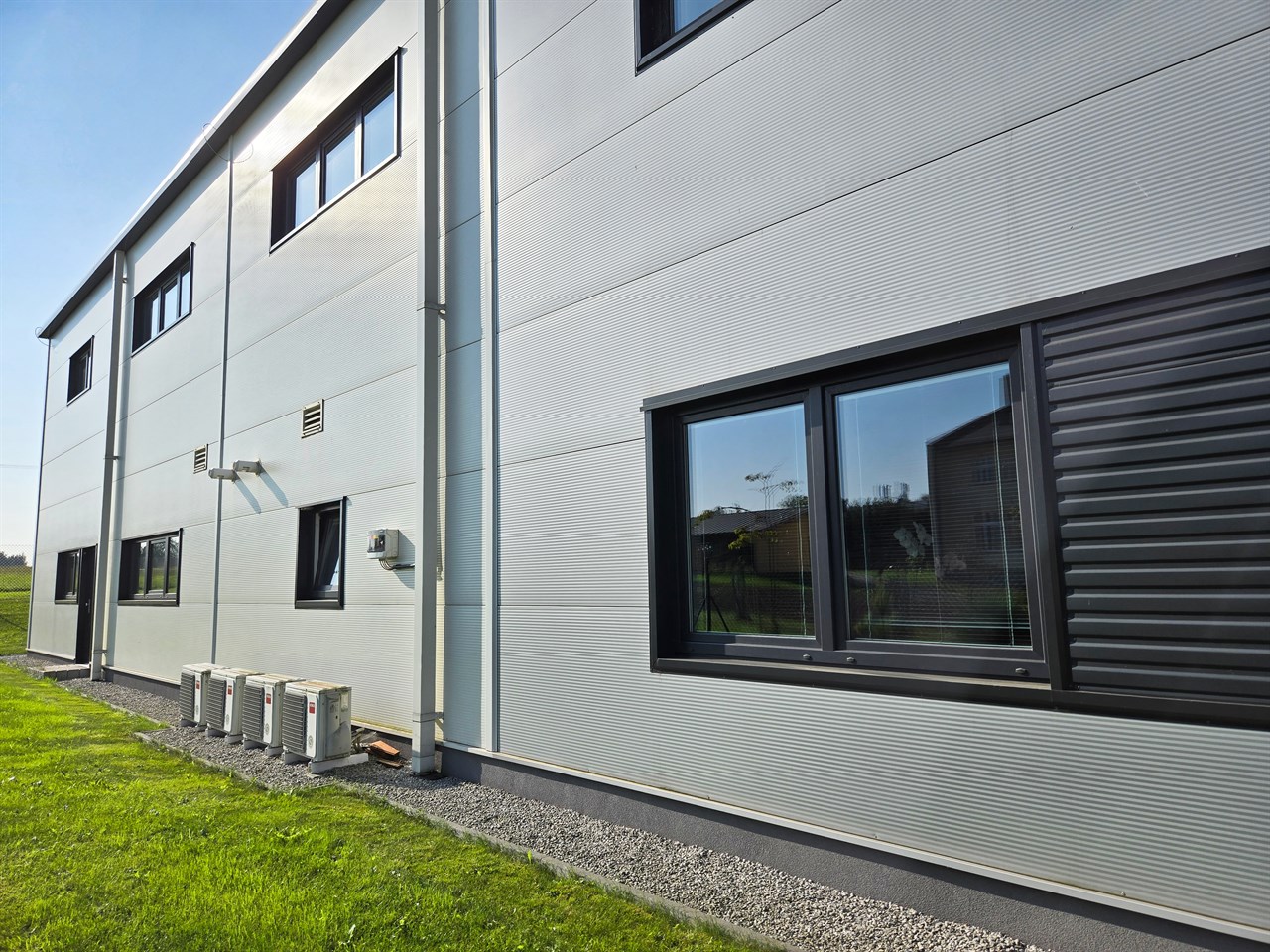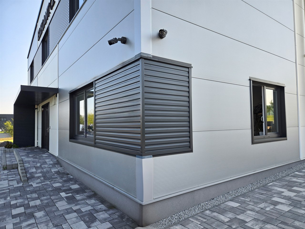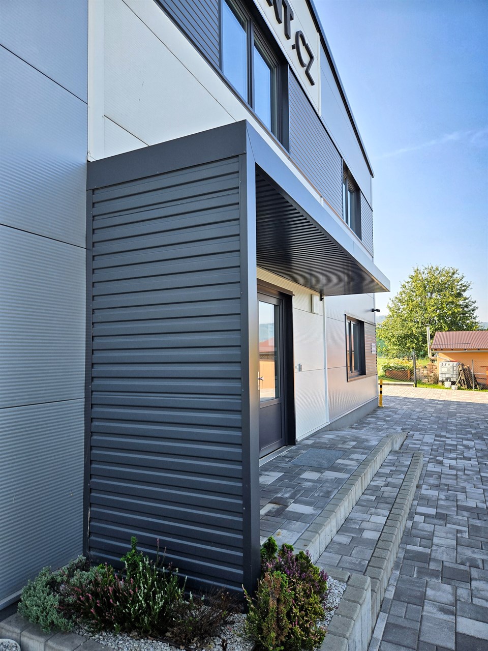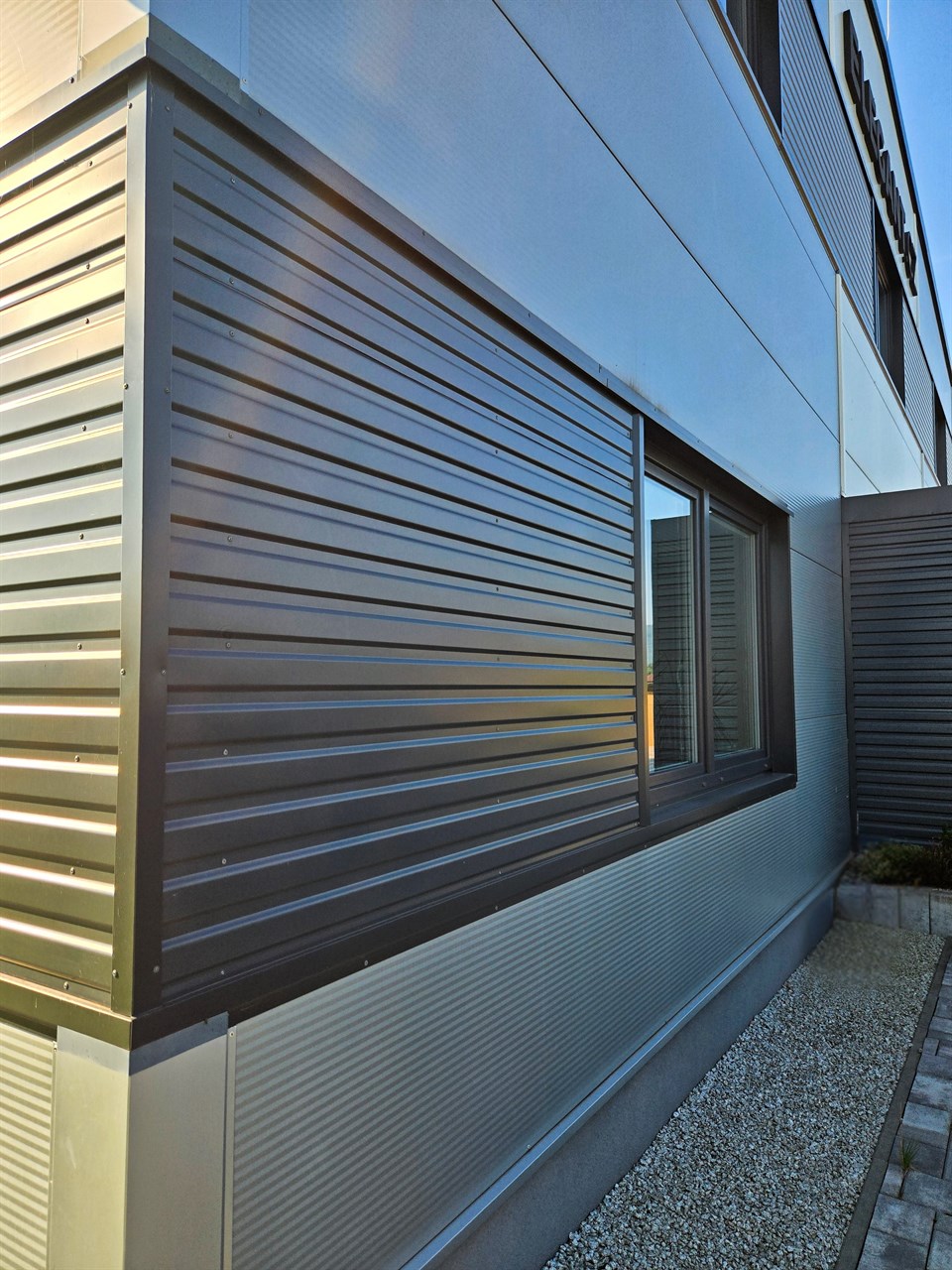 Opláštění haly je řešeno izolačními sendvičovými PIR panely. Stěny jsou z panelů tloušťky 120 mm v kombinaci bílé (RAL 9010) a šedé (RAL 9006) barvy. Střešní plášť tvoří PIR panely tloušťky 140 mm. Výpně otvorů jsou řešeny plastovými okny a dveřmi s izolačním trojsklem, které propojojí designové pásy z antracitového plechu.