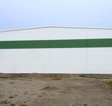 Střecha: PanelTech PW PUR-S 100.1130 tl. 100mm, RAL 9002 REI 15DP3; stěny: PanelTech PW PUR-D 100.1050 tl. 100mm profil LINIE, RAL 9002 a 6011 EW/EI 15DP3